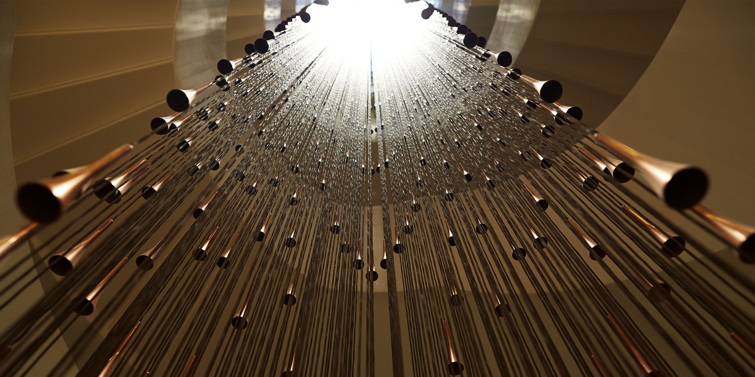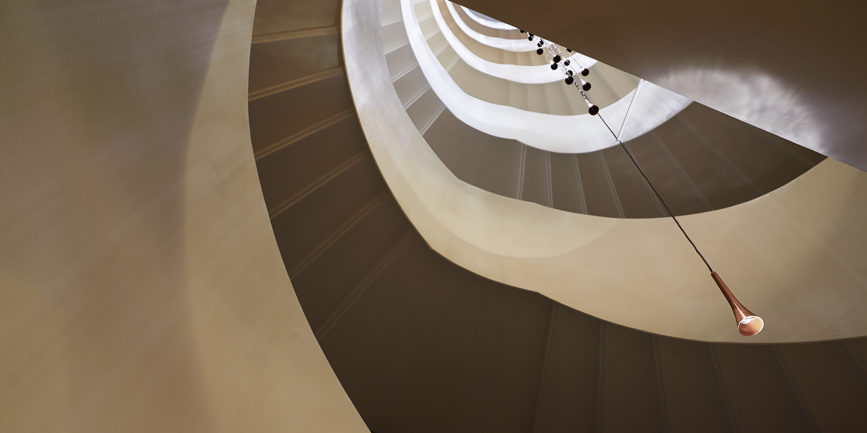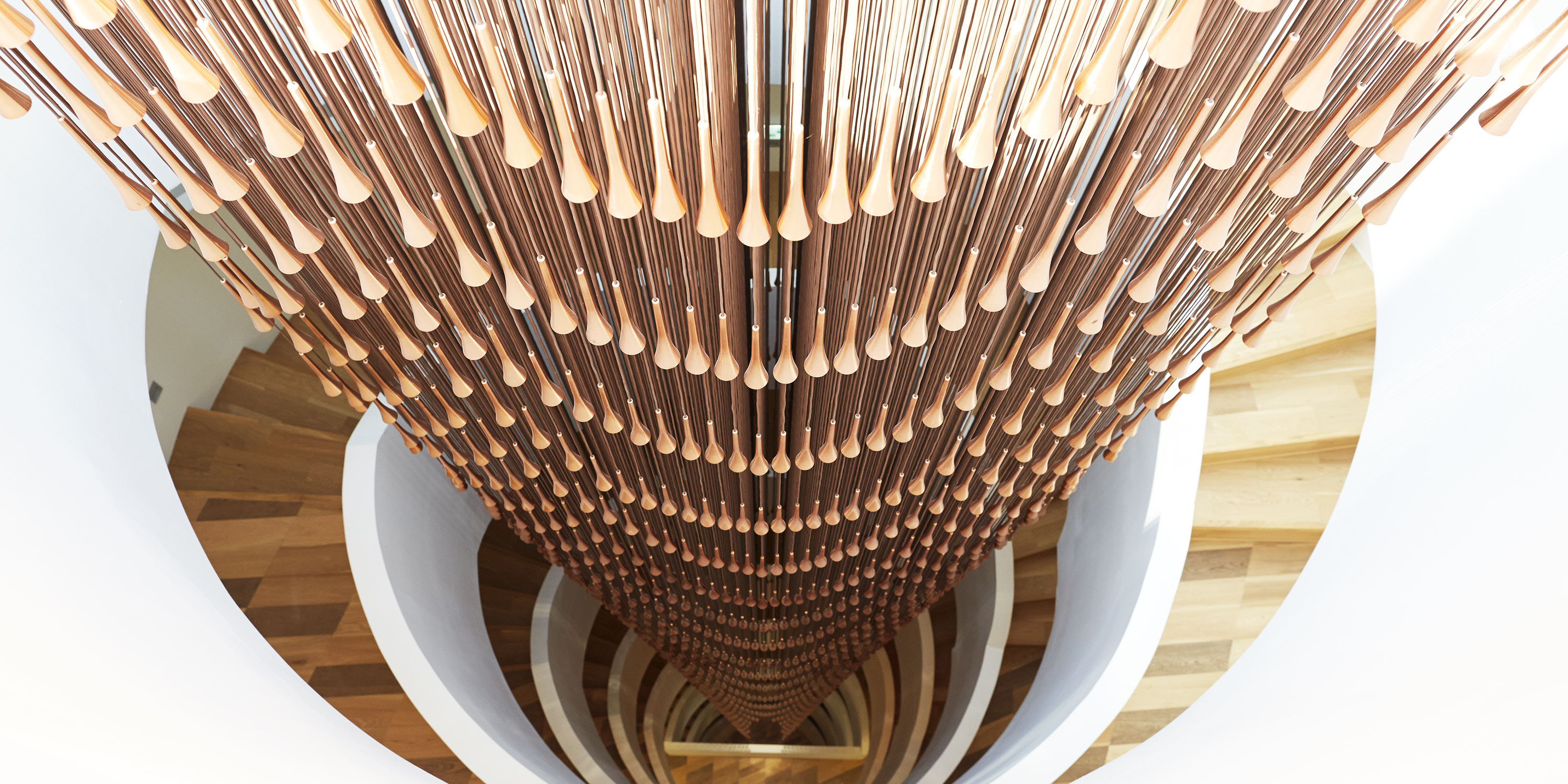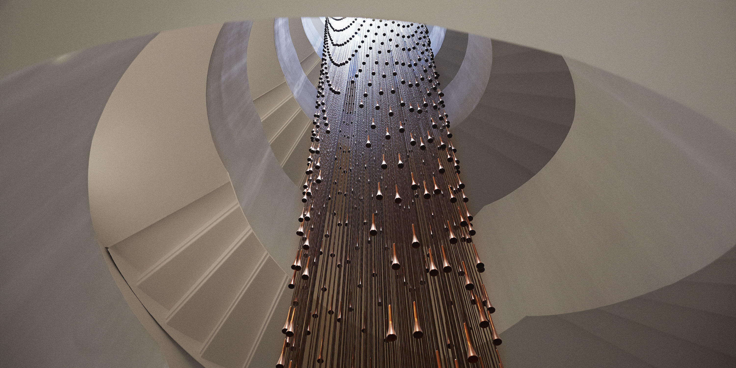 The seven-storey building had a spiral staircase that drilled through the centre of the structure from rooftop to basement. We had an idea of a hanging sculpture that could ‘fall’ through the floors.