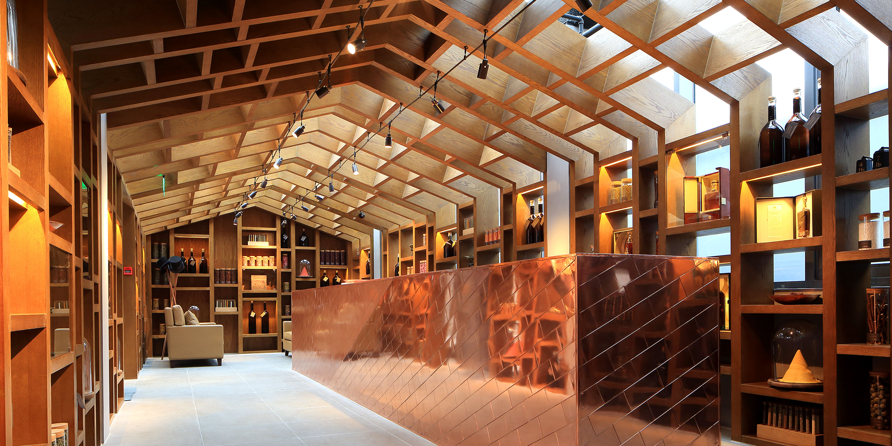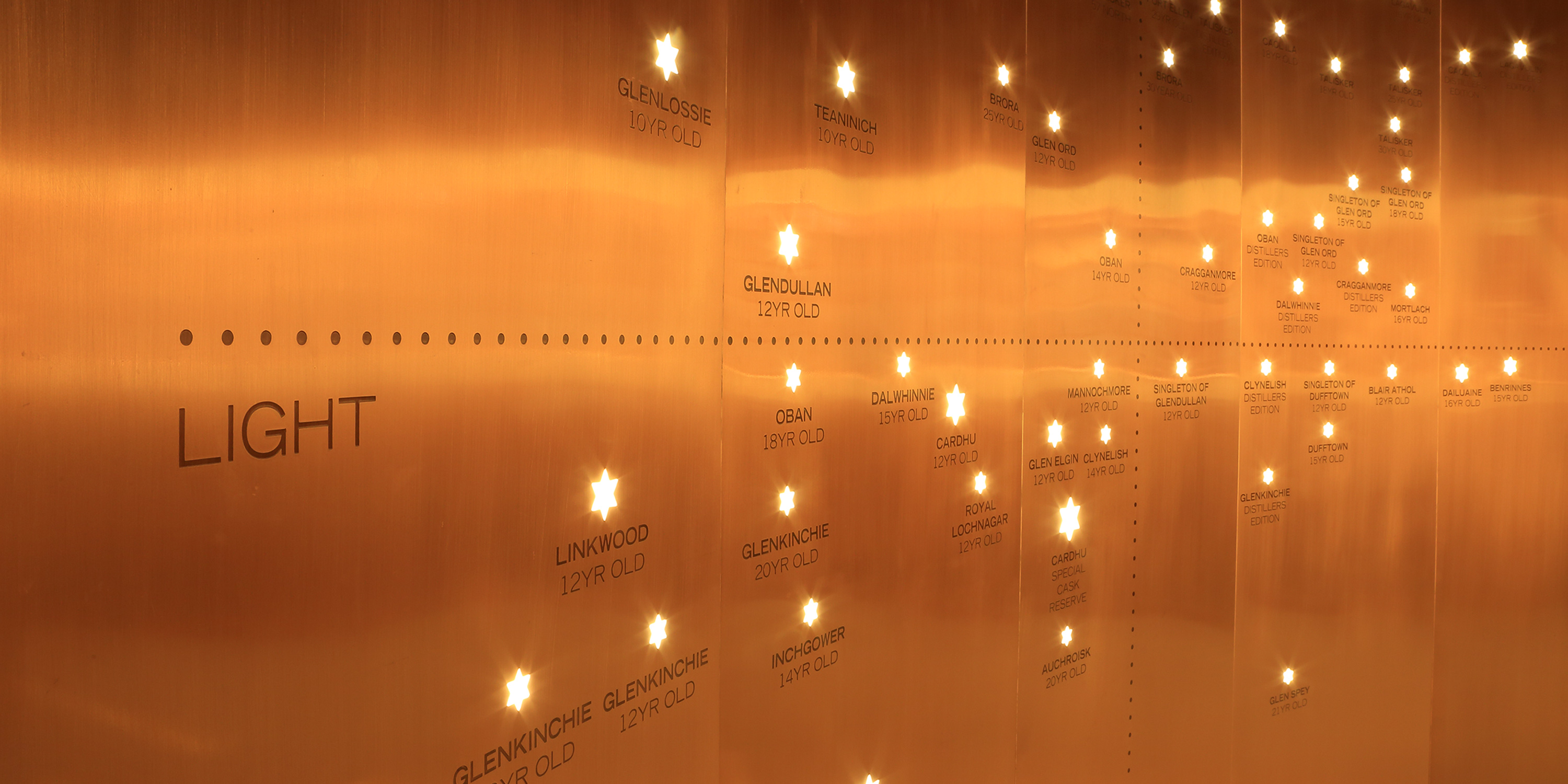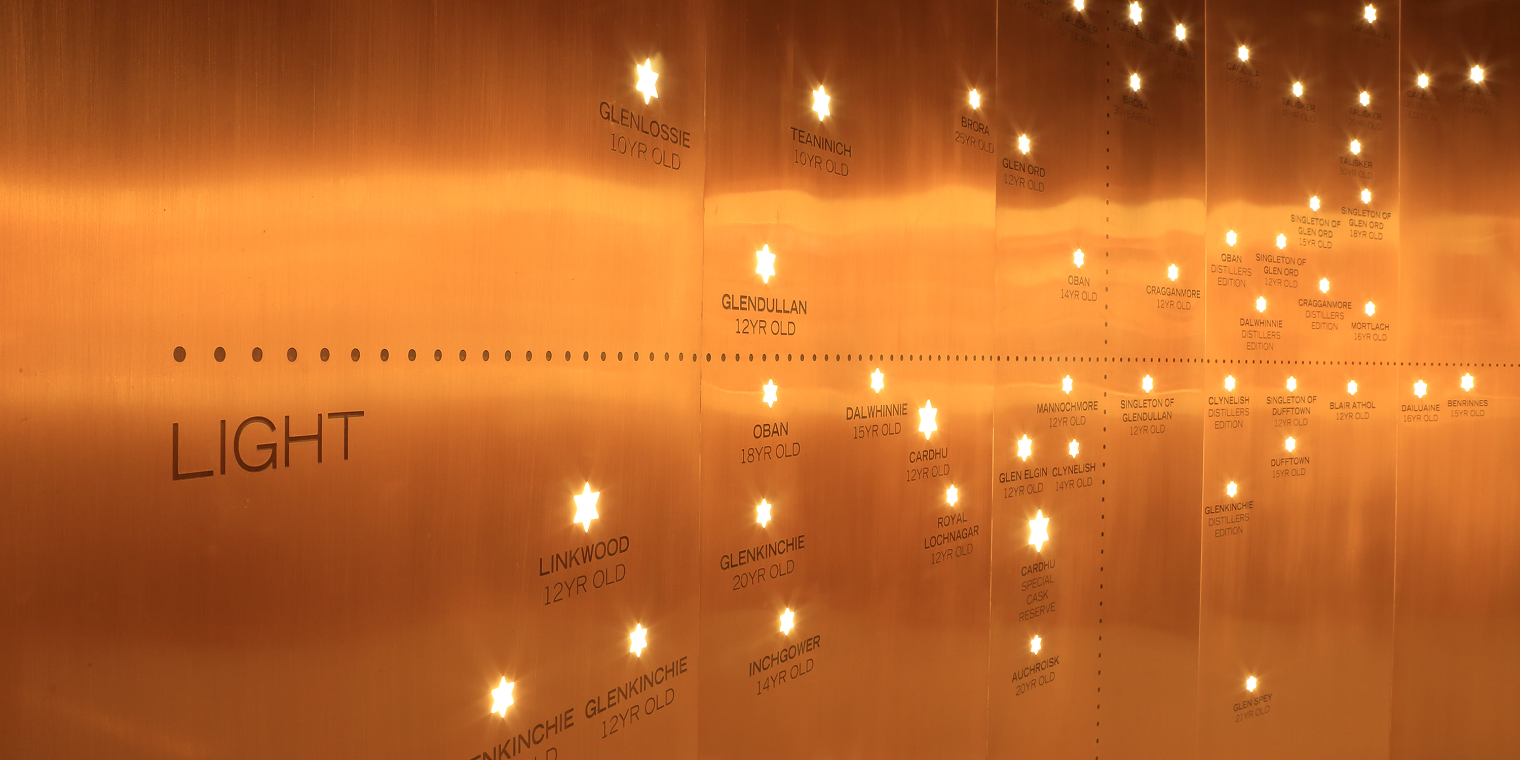 Throughout, the fabric of the space was reflected in well chosen and storied ‘whisky’ materials. Walls made of peat bricks, resin suspended barley and copper combined with flooring made of differing types of oak created a total whisky environment for visitors to walk into.