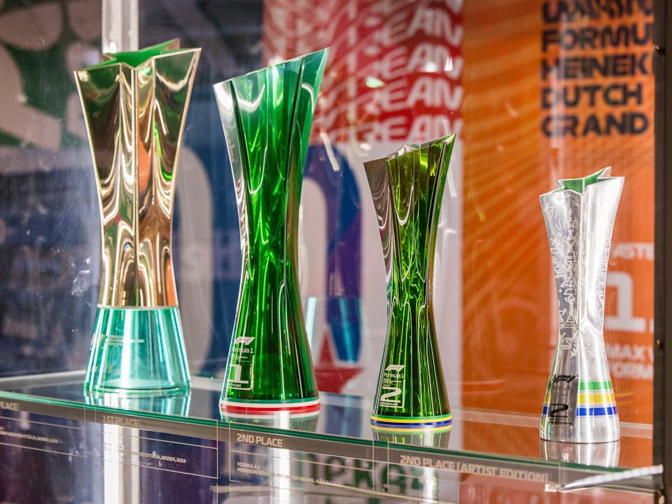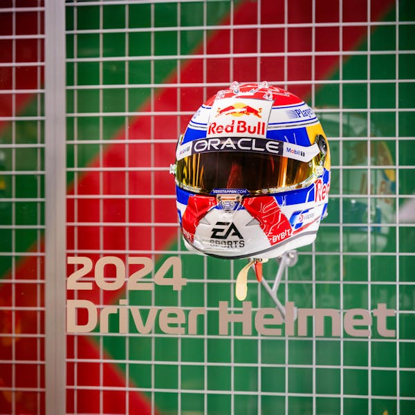 At the centre of the room, we designed two glass cabinets which held a variety of F1 memorabilia, including Max Verstappen’s 2024 Oracle Red Bull Racing suit, cap, helmet and trophies from Heineken sponsored races.