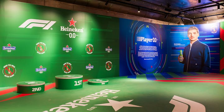 We focused on two key zones. The first was the introductory corridor where projection, starting lights, and vinyl graphics were installed to bring the Heineken trackside experience to life. A global map highlighted the Heineken’s presence across 24+ Grand Prix races.