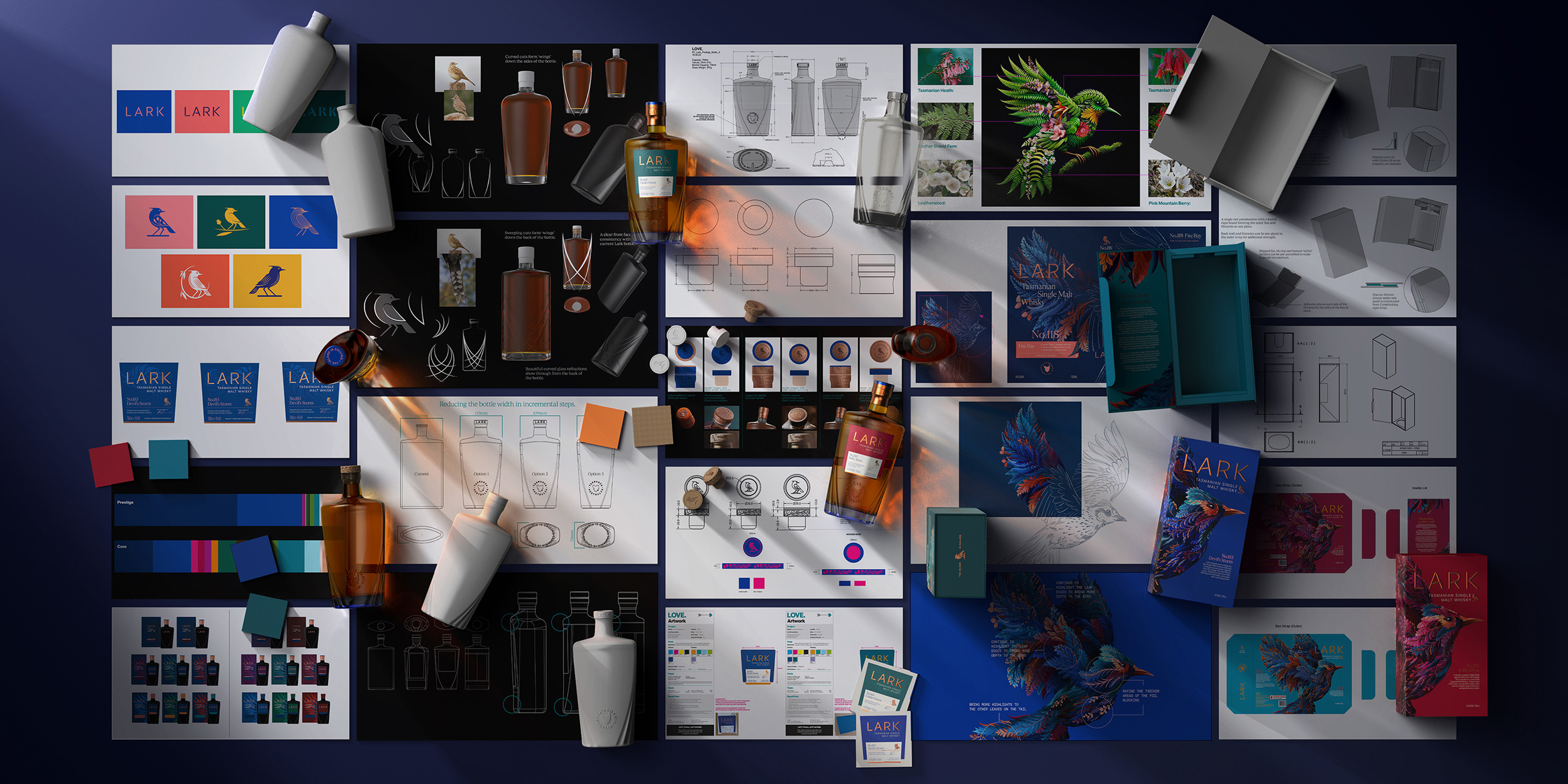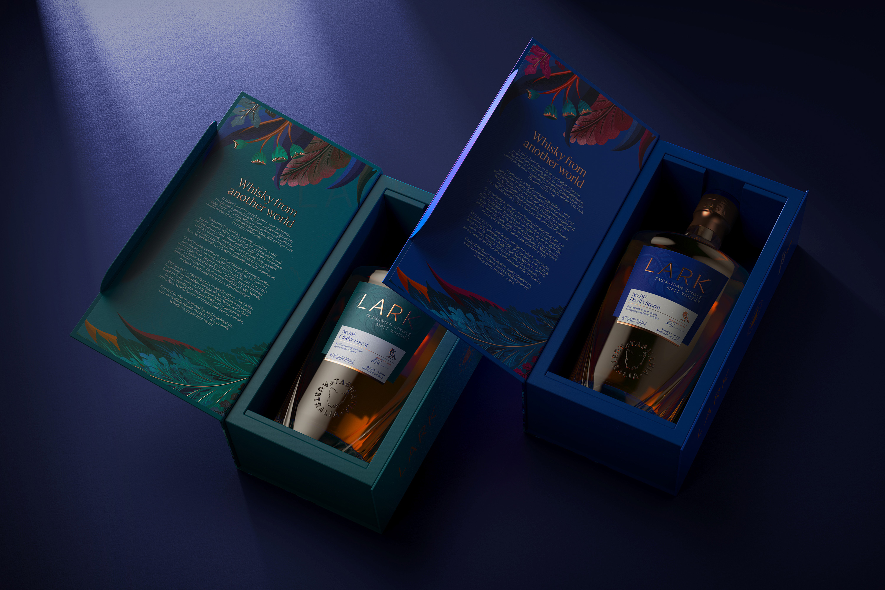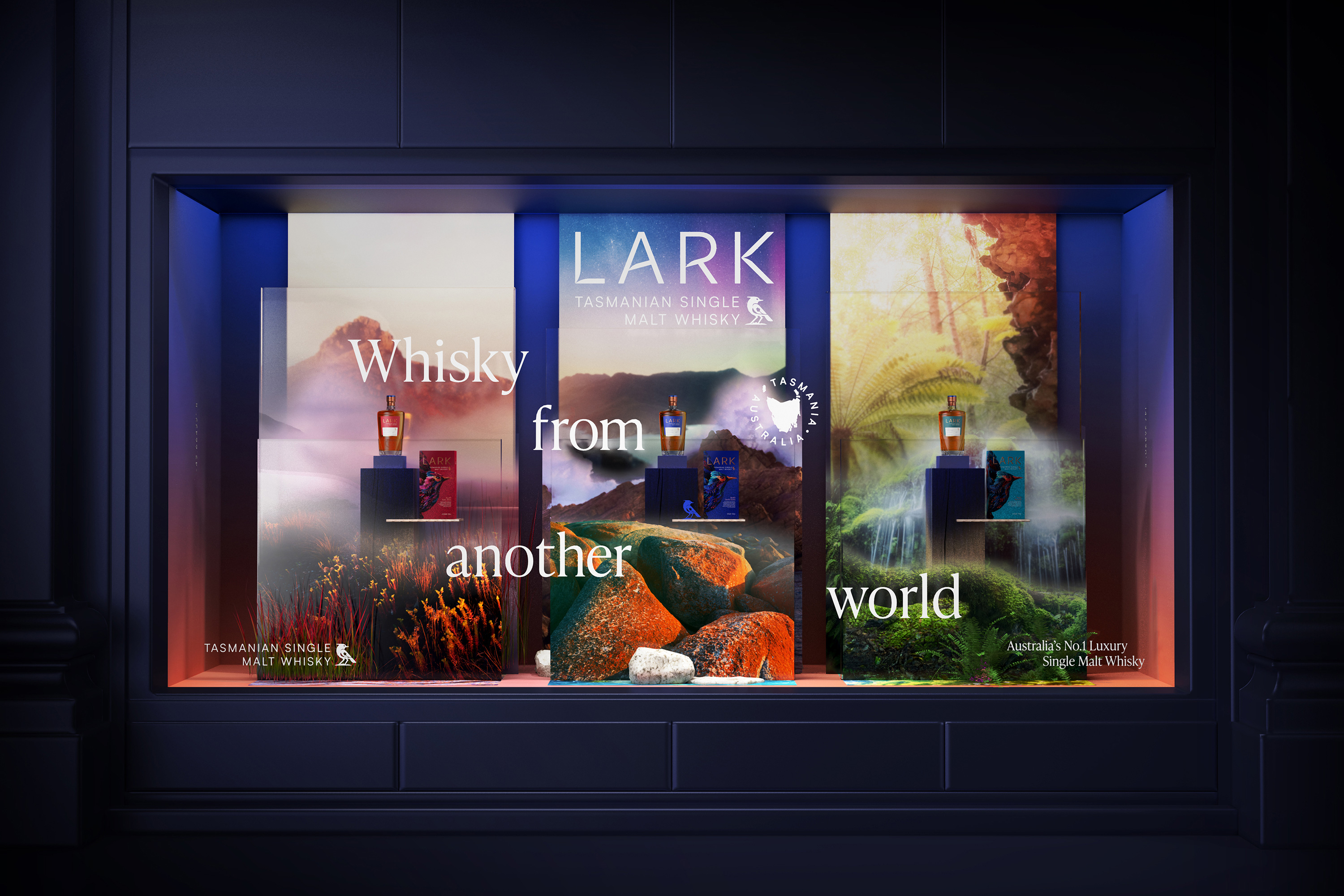 LARK wanted a total re-stage of their brand, presenting themselves (and Tasmania) as the epicentre of luxury New World Whisky. We saw an opportunity to break free from Scottish tradition and embrace the mystery of this whisky-making super-climate.