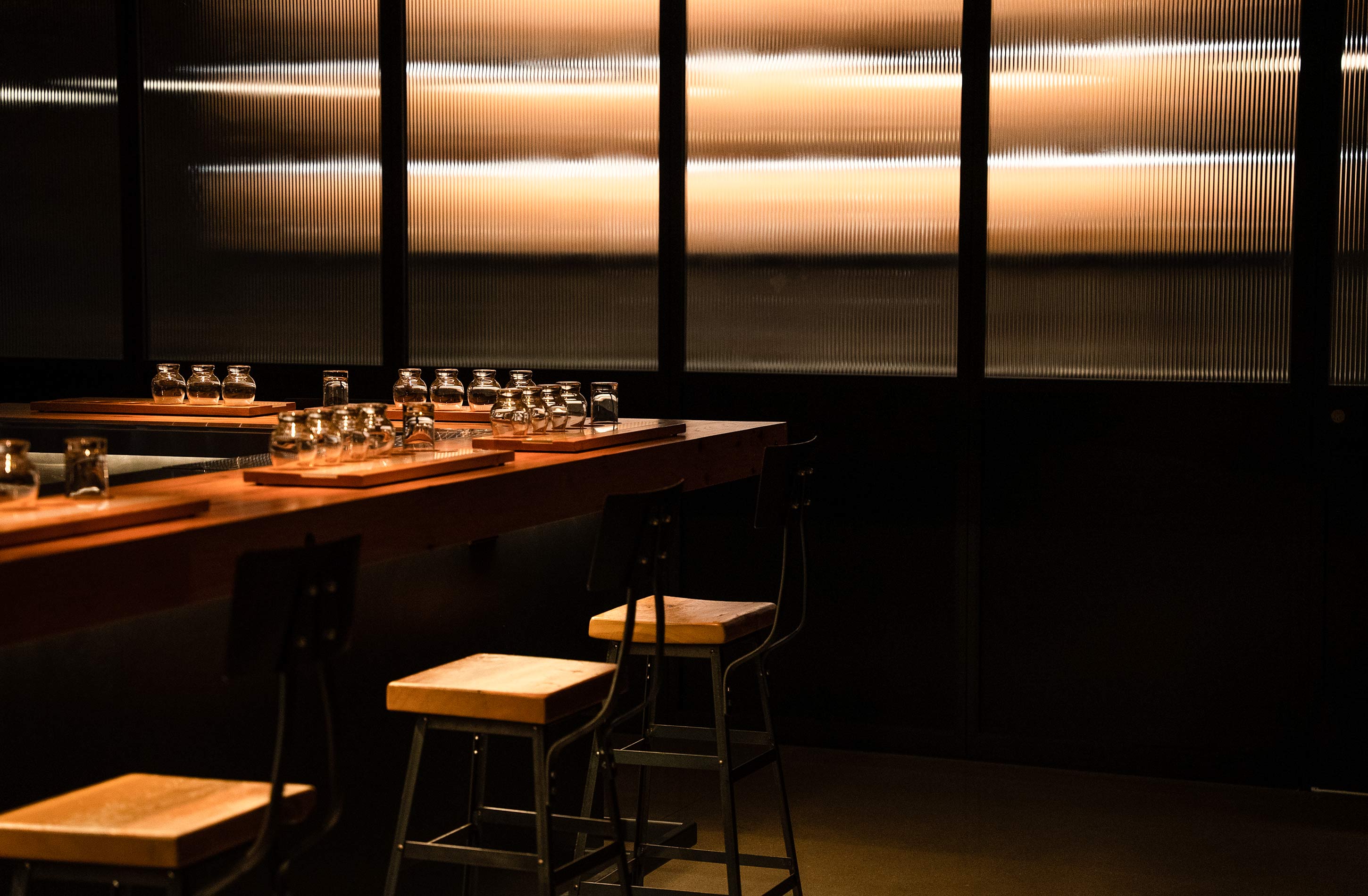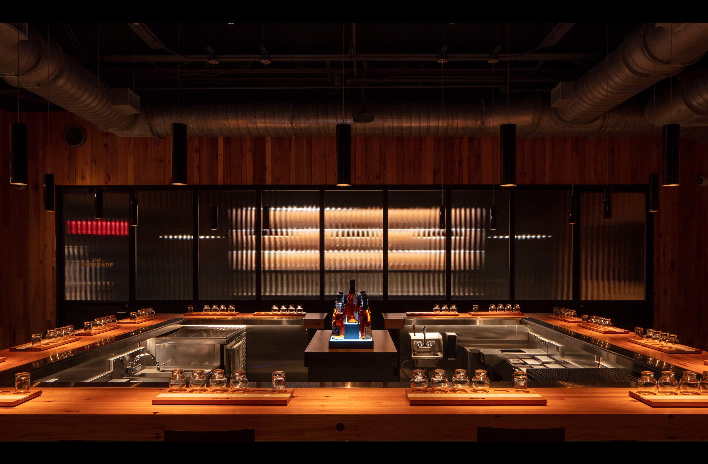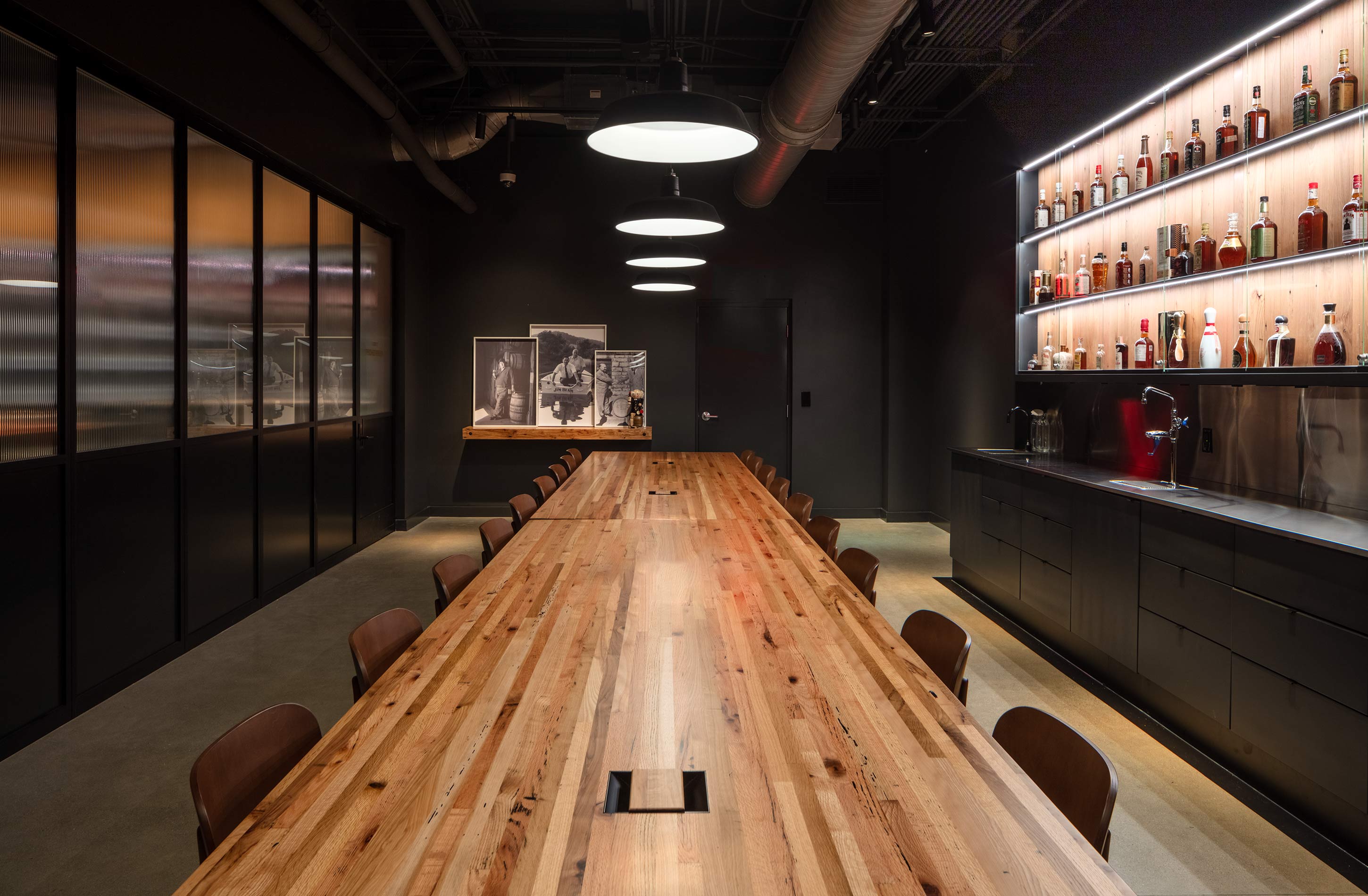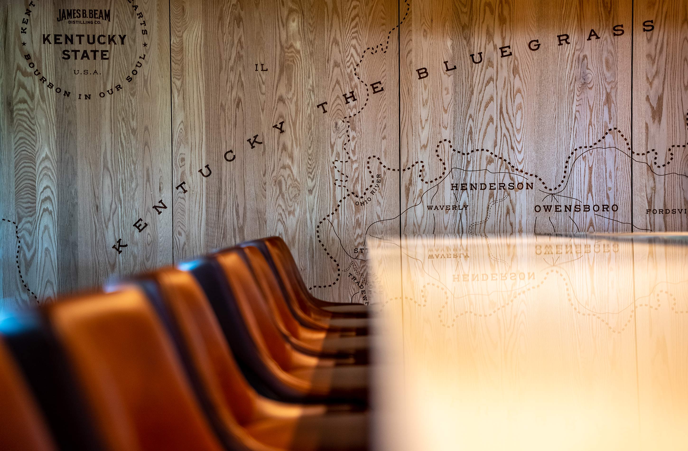 The Workshop hides behind a wall of reeded glass. This space can be used for many functions, including the exclusive Thief your Own program, where guests use bourbon taken from a Beam rackhouse to bottle and label six of their own custom blends.